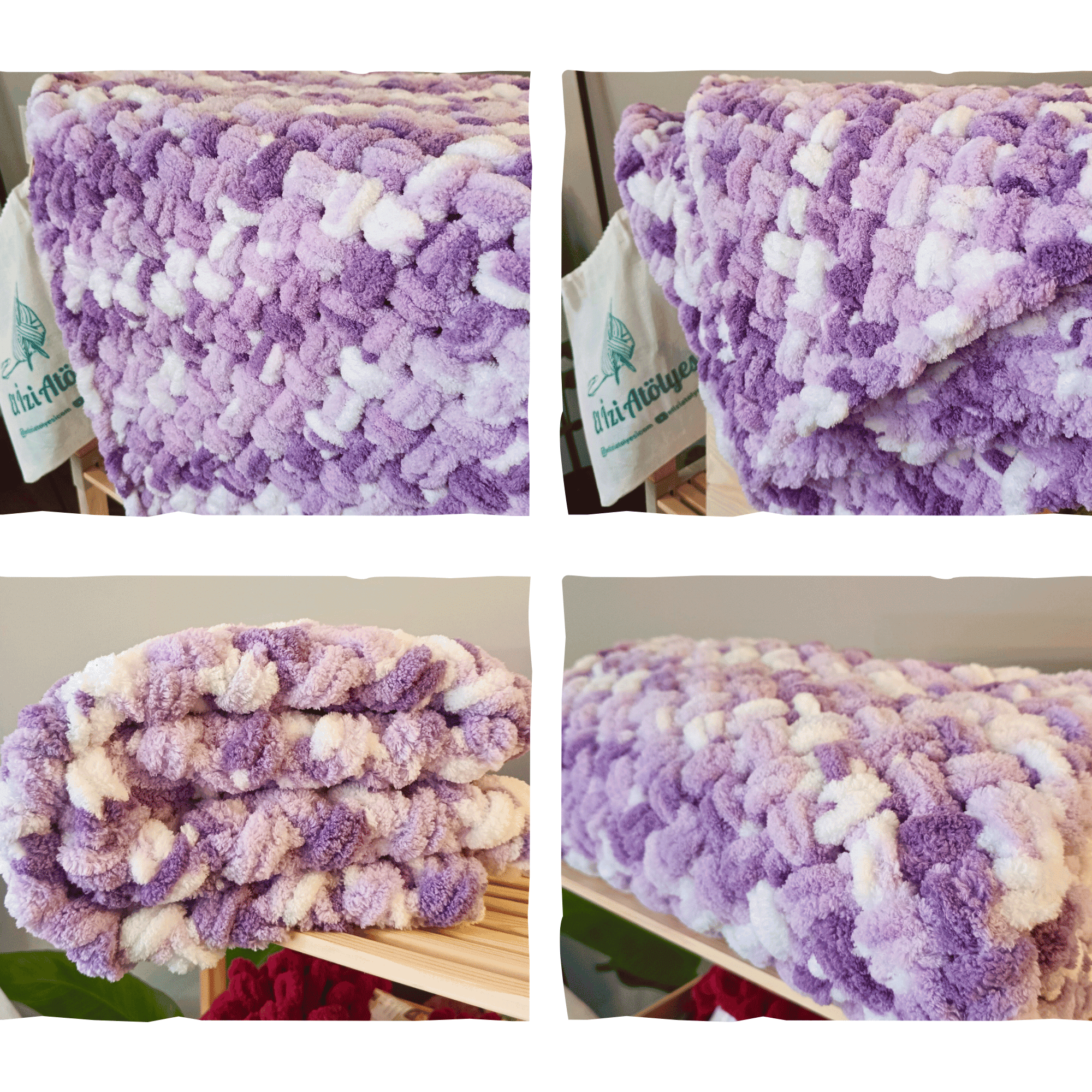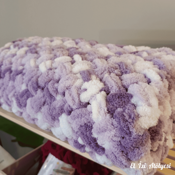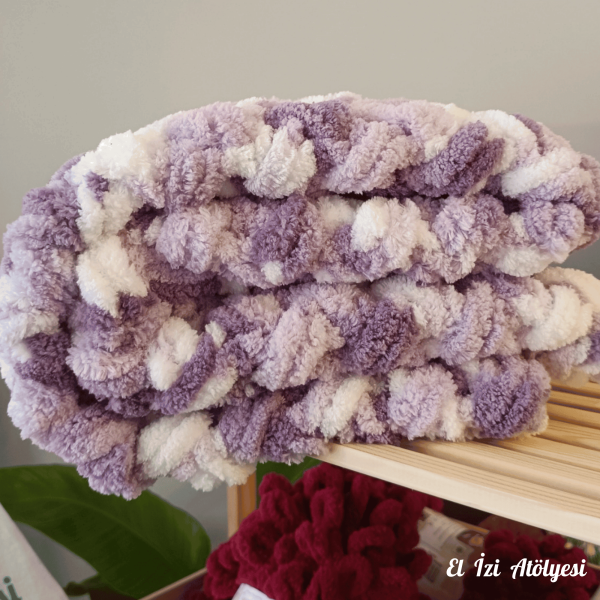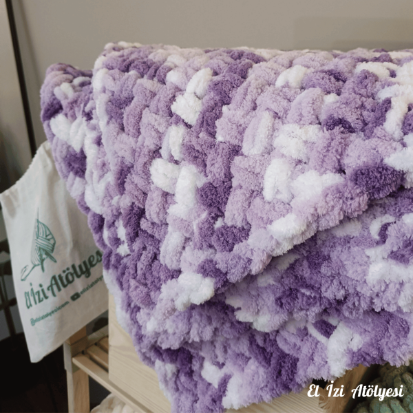 Bu yumuşak ve rahat bebek battaniyesi, sakinleştirici mor-beyaz tonlarında peluş Alize Puffy iplikle elde örülmüş. 90×90 cm ölçülerindeki battaniye, beşikler, bebek arabaları veya kucaklaşma zamanları için mükemmel boyutta. Bebek partileri, hastane ziyaretleri veya düşünceli bir yenidoğan hediyesi olarak ideal 🌿