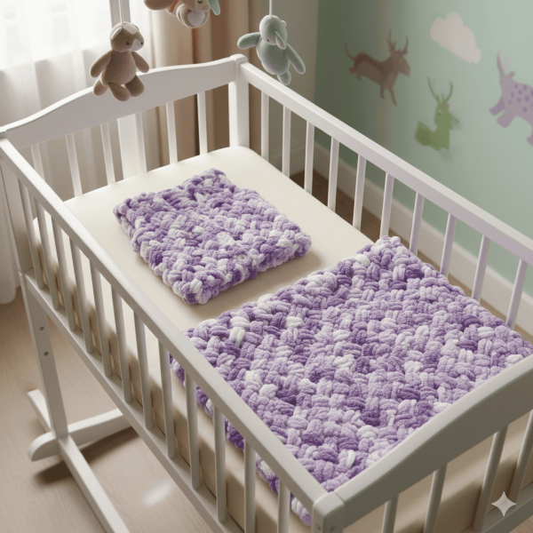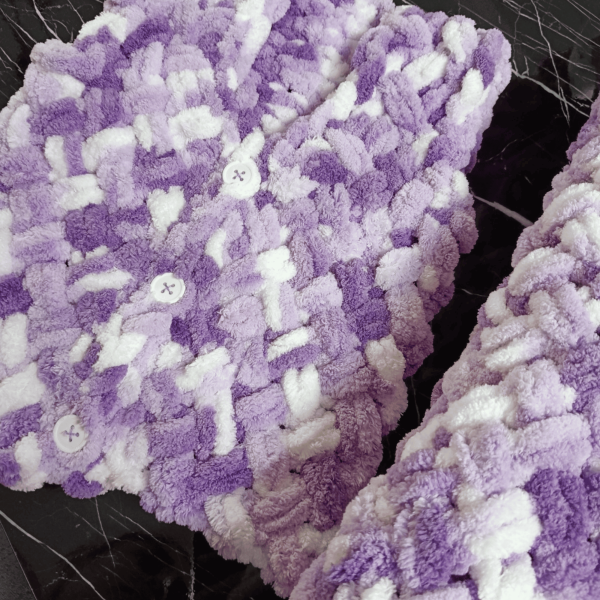 Bu yumuşak ve rahat bebek battaniyesi ve yeleği sakinleştirici mor – beyaz tonlarında peluş Alize Puffy iplikle elde örülmüş. 90×90 cm ölçülerindeki battaniye, beşikler, bebek arabaları veya kucaklaşma zamanları için mükemmel boyutta. Bebek partileri, hastane ziyaretleri veya düşünceli bir yenidoğan hediyesi olarak ideal 🌿